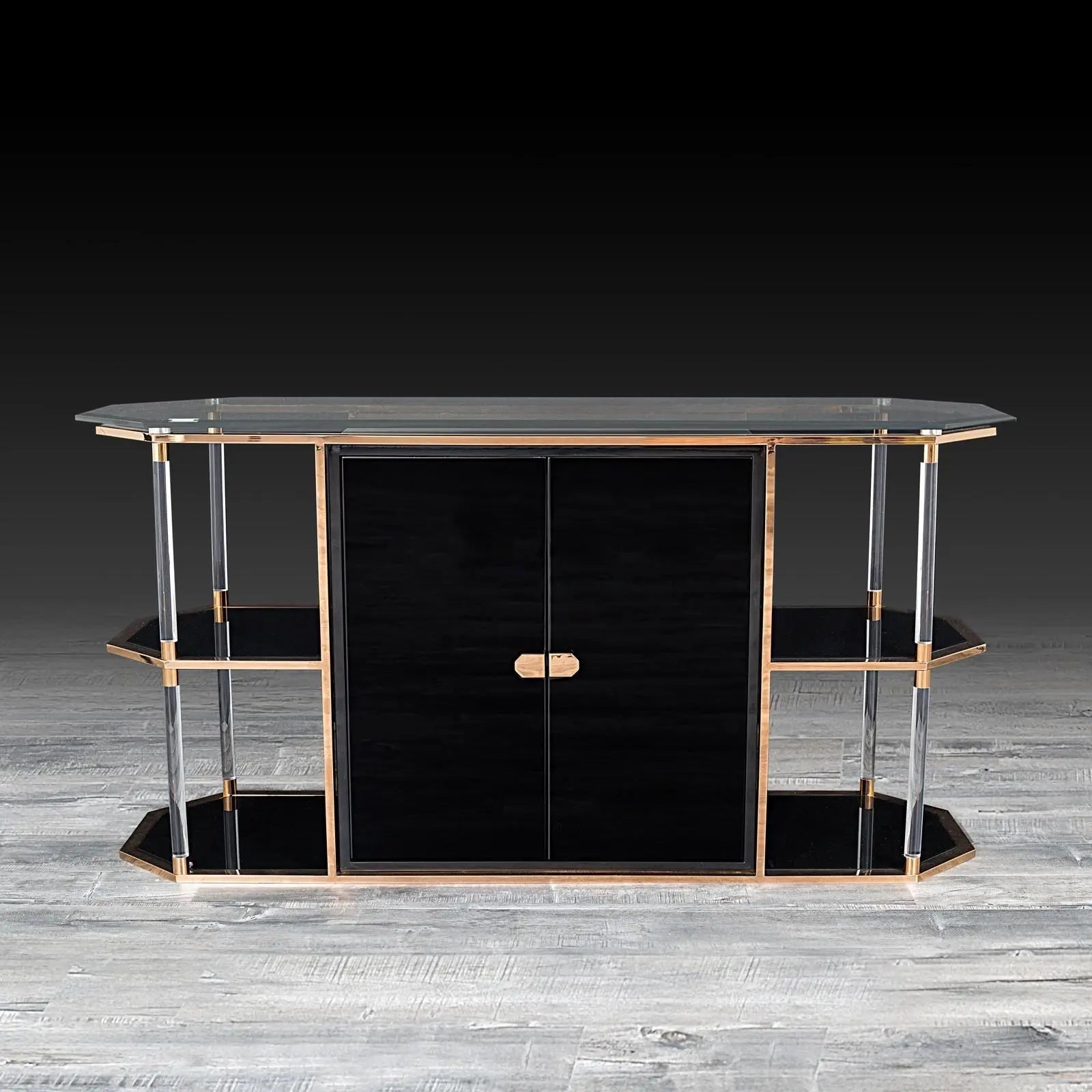 Varossi Luxury Buffet by Norhaus Furniture features clear glass top with rose gold polished stainless-steel frame, black glass shelves and a high gloss two door cabinet with clear lucite frame connections.