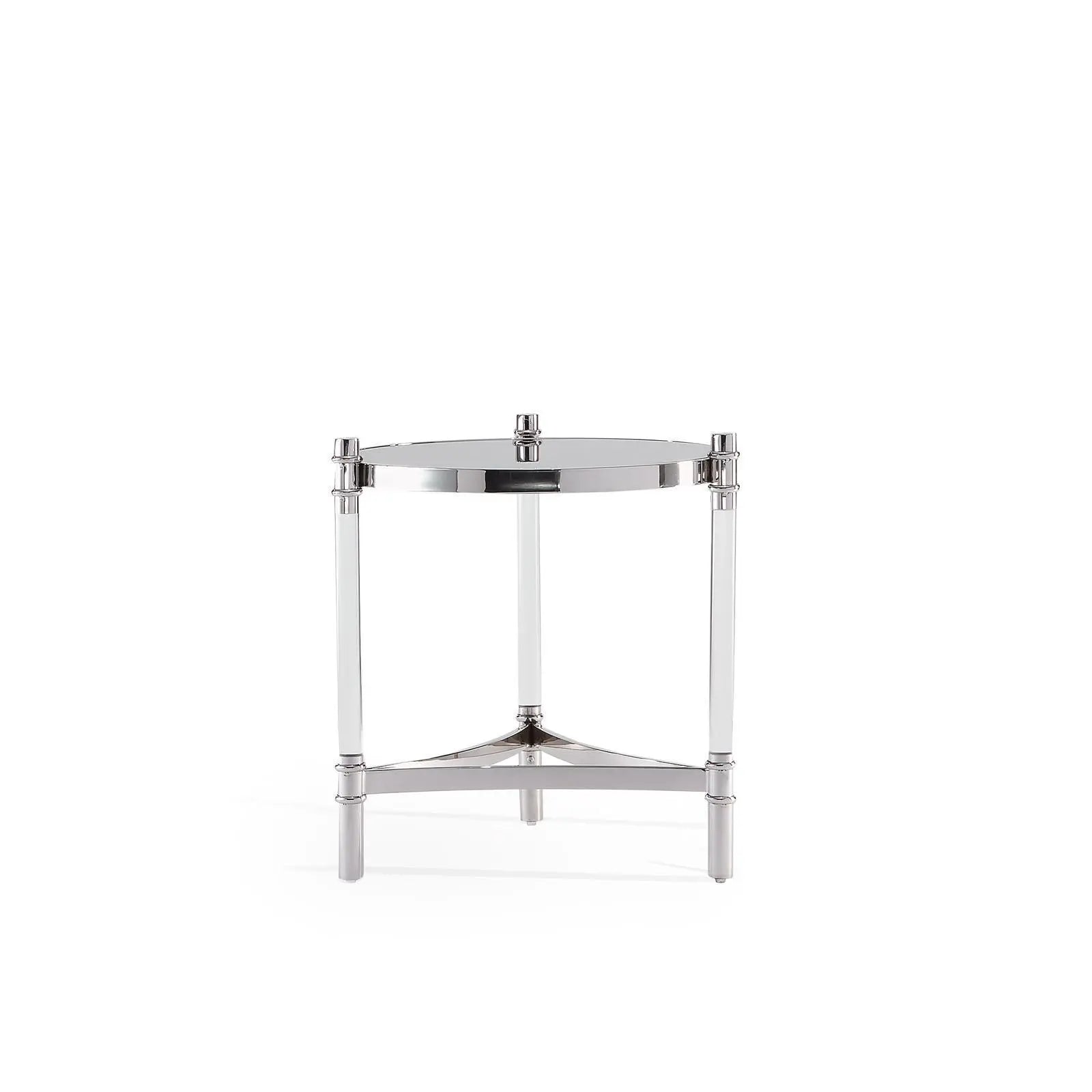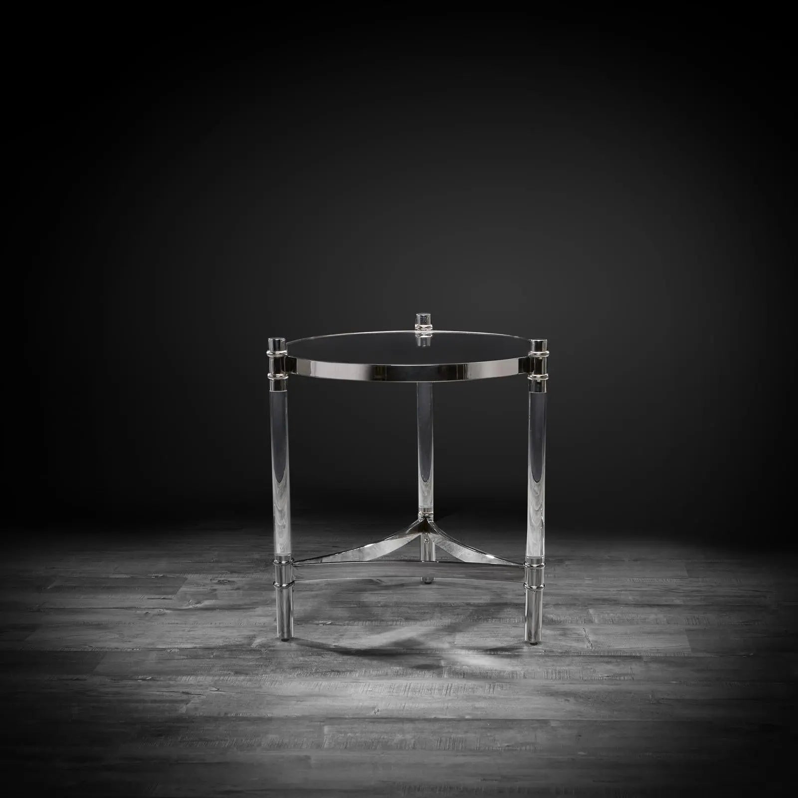 Varossi silver trio round modern coffee table by Roberto Grassie features silver stainless steel base and frame supported by clear lucite connections with black tempered glass top.