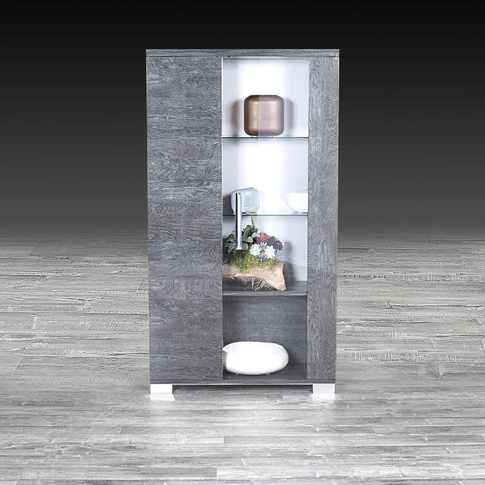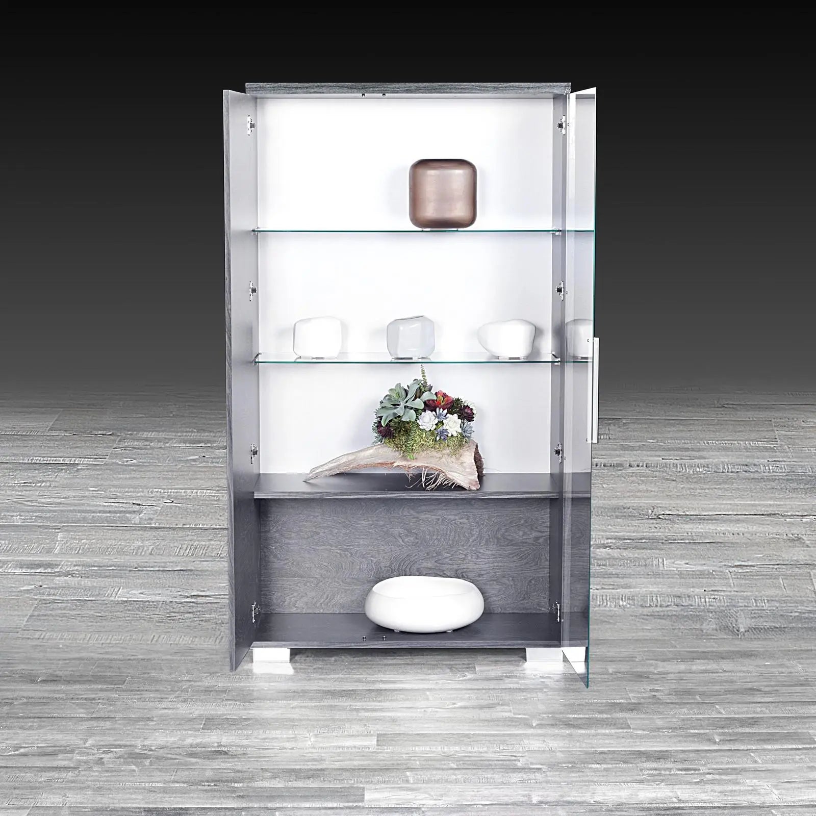 - Bottom Shelf: Gray Birch High Gloss Lacquer