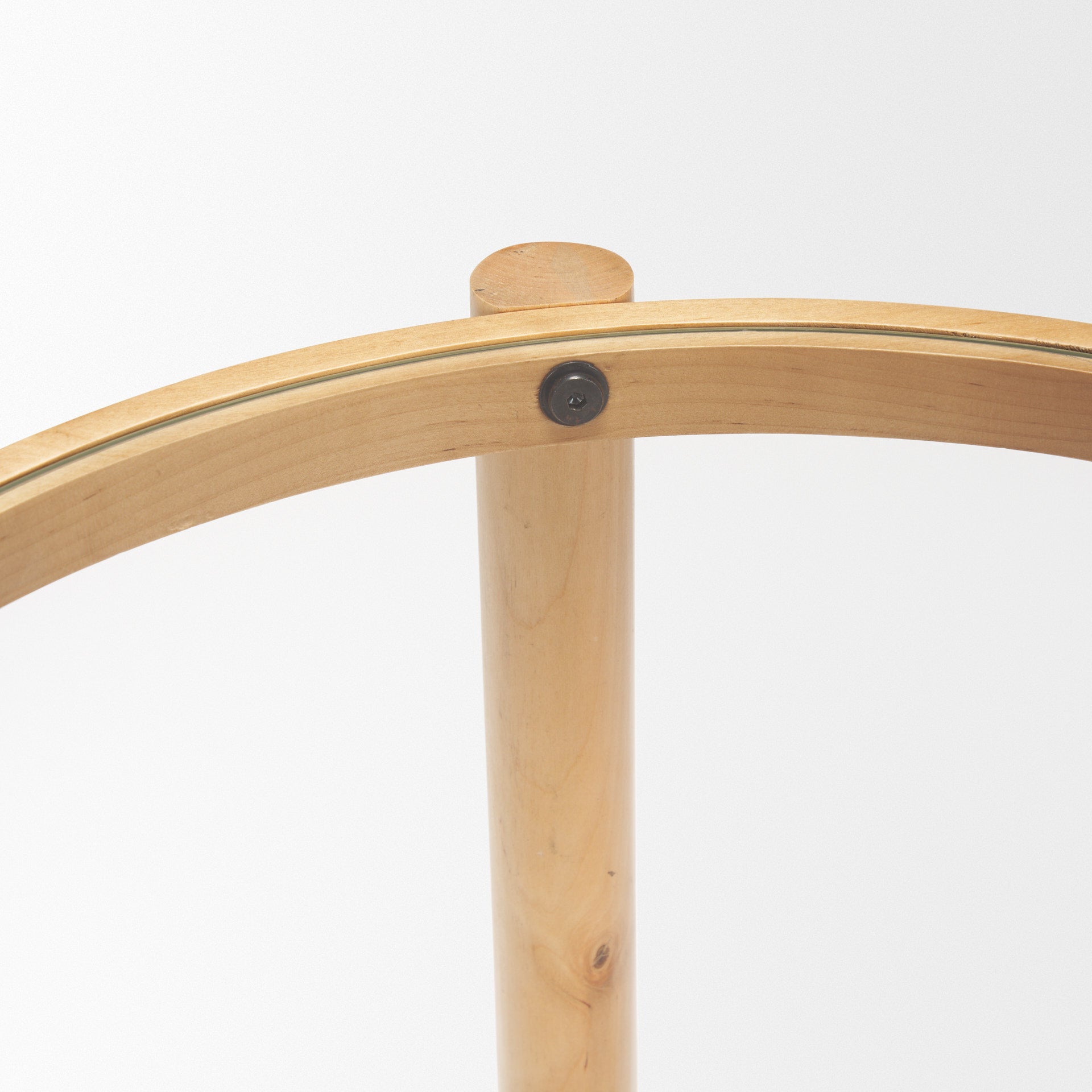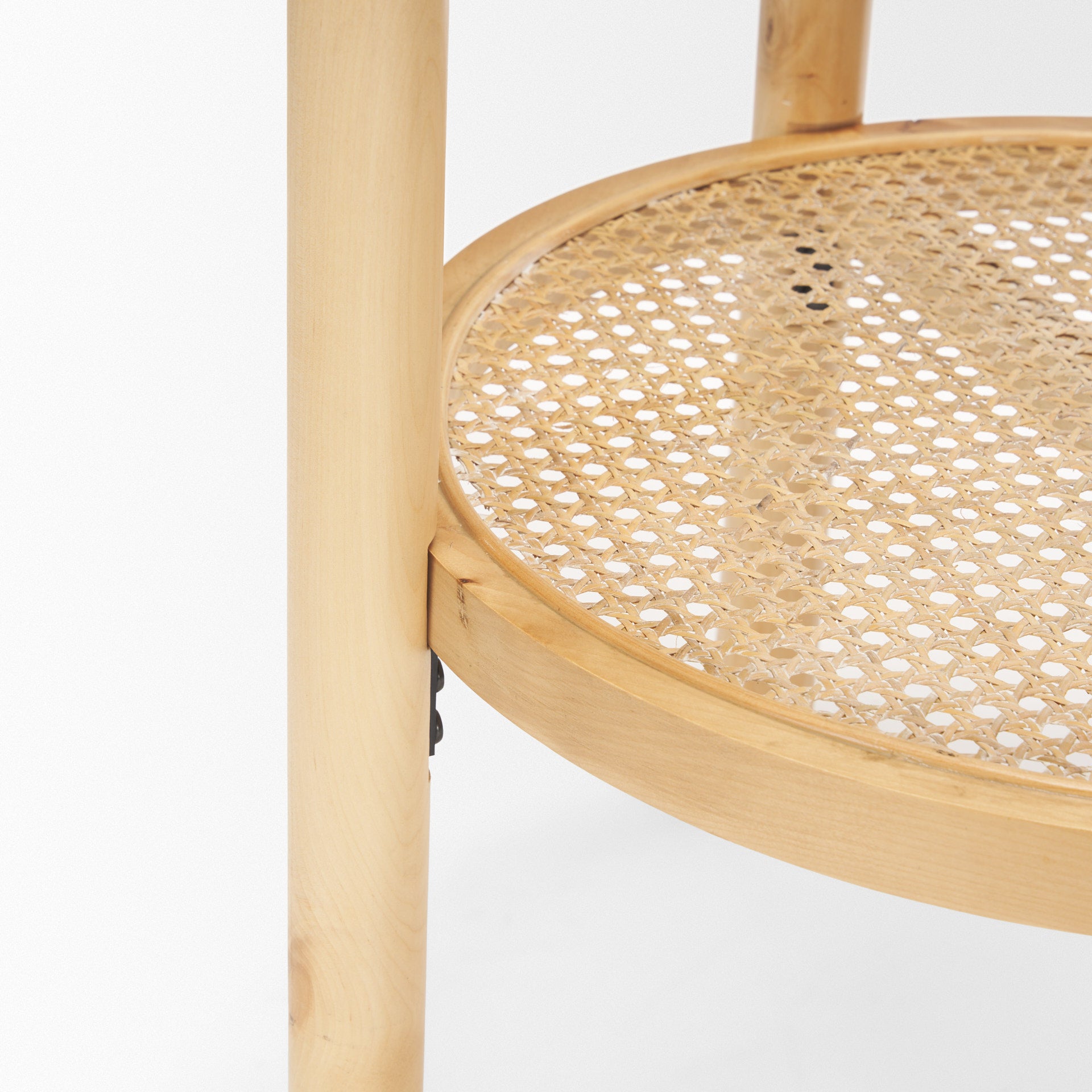 Weslyn is a round, light brown solid birchwood side table with a woven cane bottom shelf and smooth, clear glass tabletop.