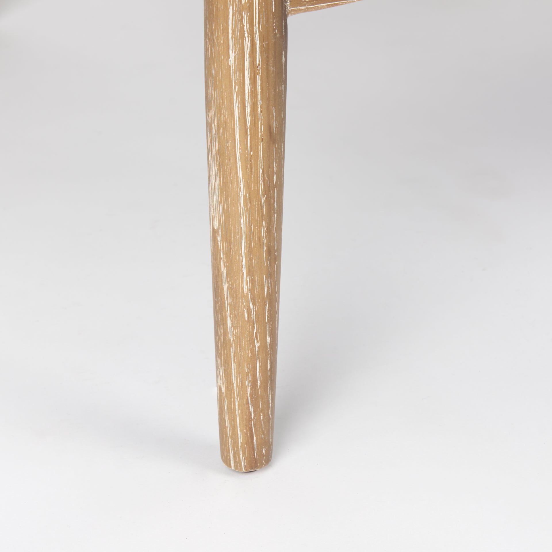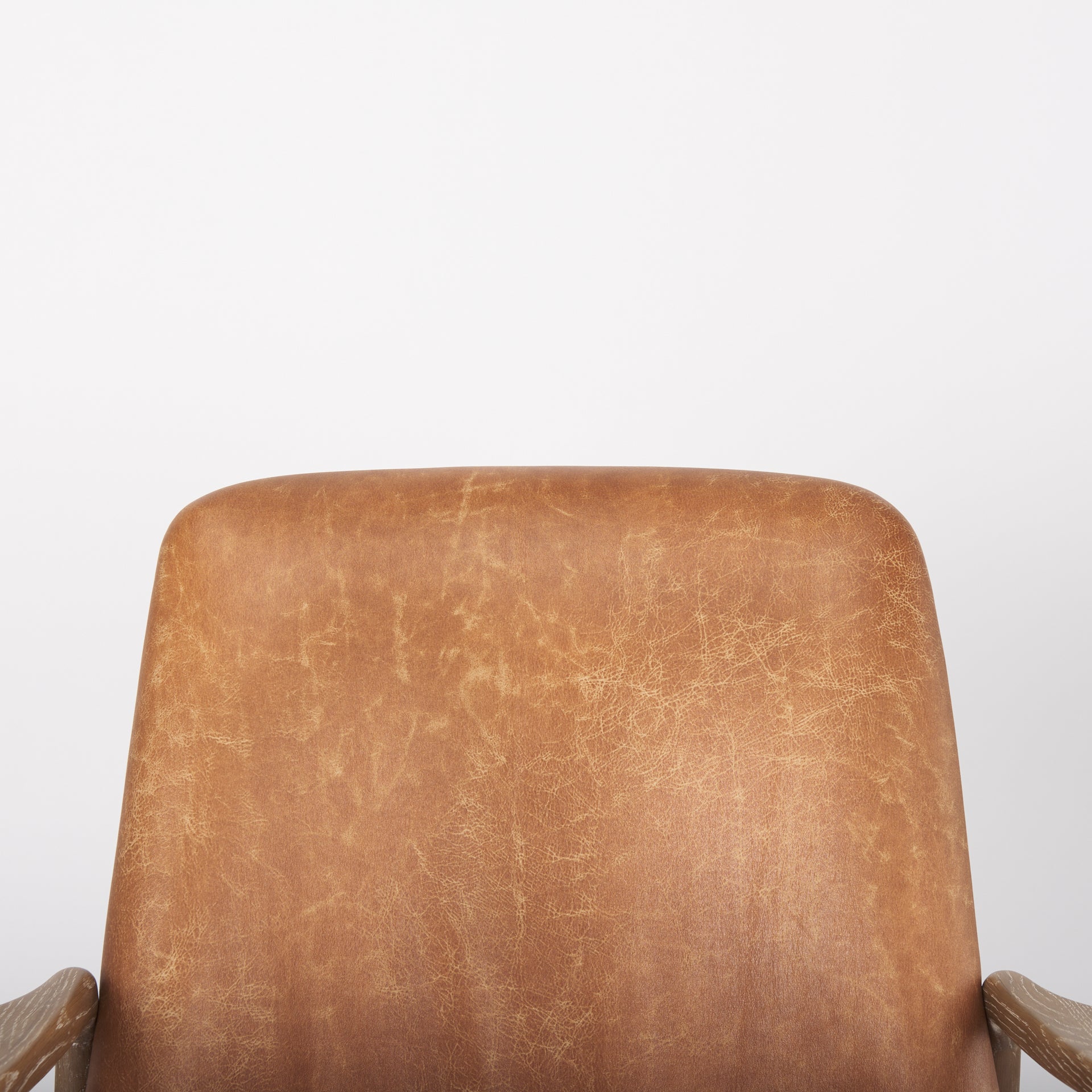 Distresses cognac faux leather offers sophistication and textural interest. Solid beech wood frame in a lightly whitewashed medium-brown finish adds visual contrast.